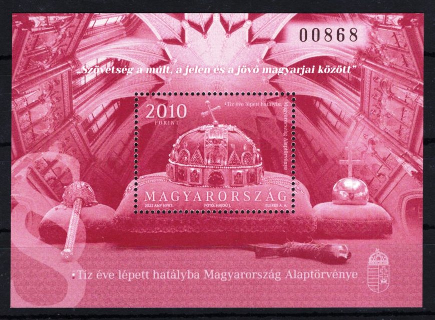 ** 2022 10 éve lépett hatályba Magyarország alaptörvénye blokk egyszínnyomat fekete sorszám